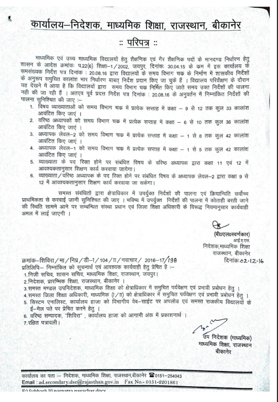 निदेशक महोदय माध्यमिक शिक्षा बीकानेर के द्वारा समय समय पर जारी कालांश भार निर्धारण आदेशों के अनुसार विषयाध्यापकों का time table में पदवार कालांश भार निर्धारित किया गया है –