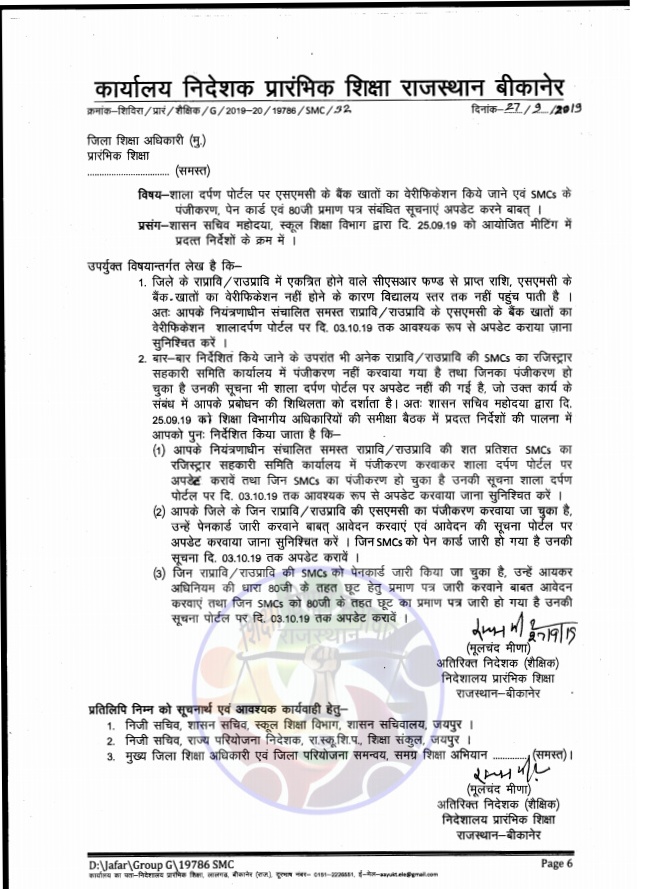 शालादर्पण पोर्टल पर SMC के बैंक खातों का वेरिफिकेशन एवं SMC के पंजीकरण पेन कार्ड एवं 80 G प्रमाण पत्र सम्बंधित सूचनाएं अपडेट करने बाबत |