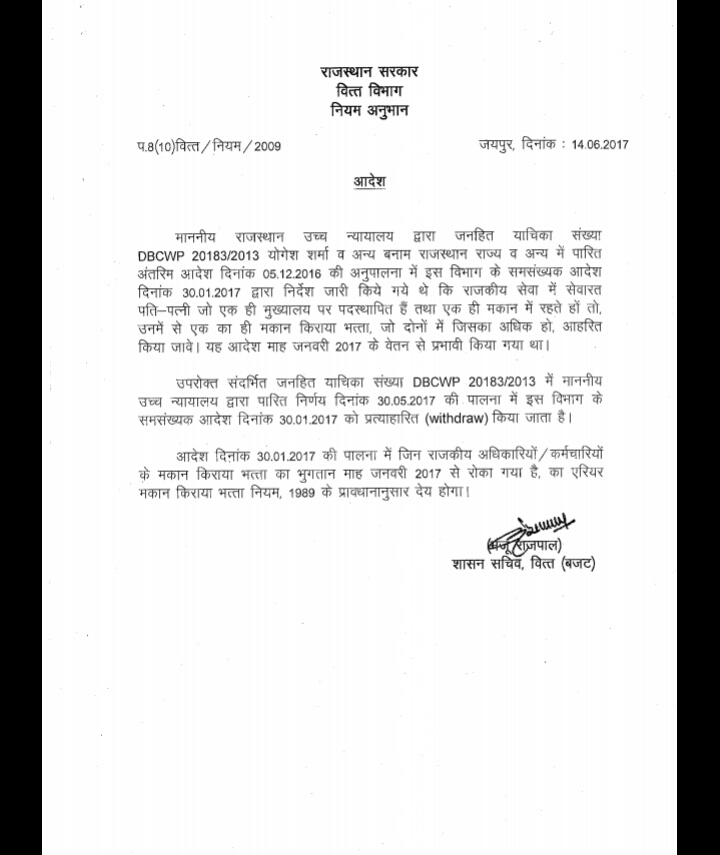पति-पत्नी मकान किराये भत्ते के सम्बन्ध में निर्देश |